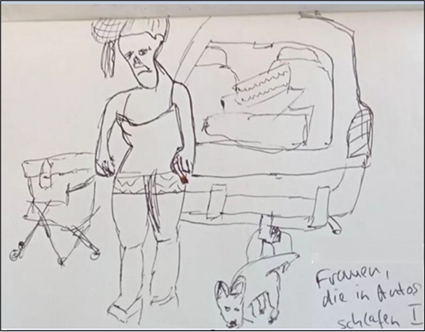 Claus beschließt, Frauen, die in Autos schlafen, zu malen. Kulli auf Papier.