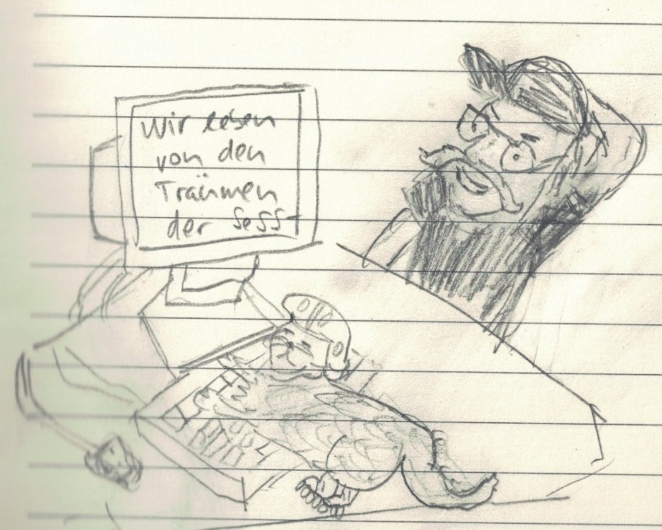 Claus hat eine Idee für sein nächstes Buch: „Wir leben von den Träumen der Sesshaften“. Claus tippt vergnügt in ein Word-Dokument. Polly legt sich auf die Tastatur und räkelt sich. Claus verwirft seine Idee.