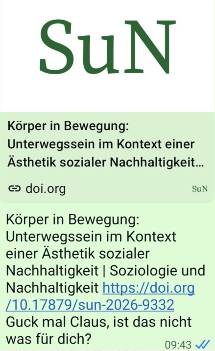 Guck mal Claus, ist das nicht was für dich? Körper in Bewegung: Unterwegs sein im Kontext einer Ästhetik sozialer Nachhaltigkeit. Link: https://doi.org/10.17879/sun-2026-9332. Sofort erscheinen zwei blaue Häkchen. Claus hat also angebissen.